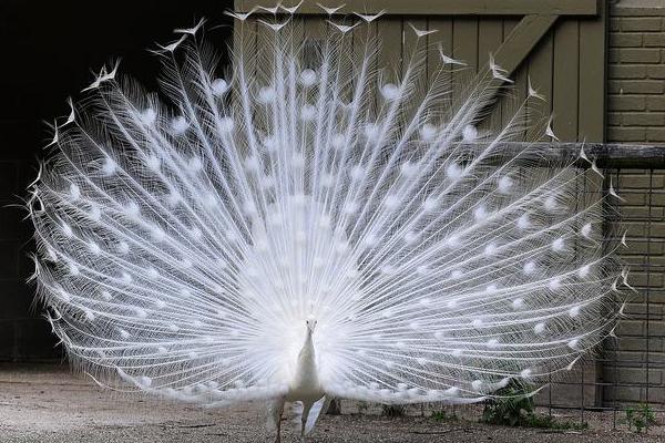 4、白孔雀:白孔雀是人工繁育下蓝孔雀的白化品种,全身雪白,其变异率约为1/1000,较为罕见,这主要是由于基因突变的低频性导致的,但经过人工驯养已经达到了种群自我维持的状态。
