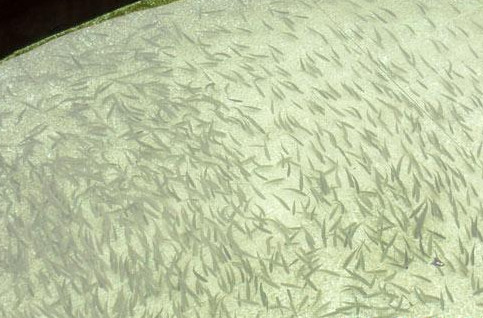 ③驯化投饵:应用动物条件反射原理,在投饵的同时敲击物体,发出简单有节奏的响声传到水中,使鱼类在摄食时,能感知声音,经过一定时间,鱼类形成声音取食的条件反射,当鱼类感知声音后,纷纷游至发声区域摄食。