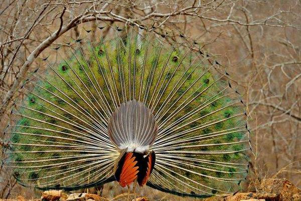 4、孔雀尾屏主要是由尾部上方的覆羽构成,覆羽极长,羽尖有虹彩光泽的眼圈,周围颜色为蓝色和青铜色,雄孔雀在求偶时,会将尾屏下的尾部竖起,在求偶表演达到高潮时,雄孔雀的尾羽会颤动,闪烁发光,并发出嘎嘎响声。
