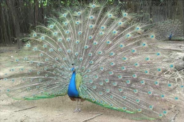 2、防御:在孔雀的大尾屏上,我们可以看到五色金翠线纹,其中散布着许多近似圆形的眼状斑,这种斑纹从内至外是由紫、蓝、褐、黄、红等颜色组成的。一旦遇到敌人而又来不及逃避时,孔雀便突然开屏,然后抖动它沙沙作响,很多的眼状斑随之乱动起来,敌人畏惧于这种多眼怪兽,也就不贸然前进了。