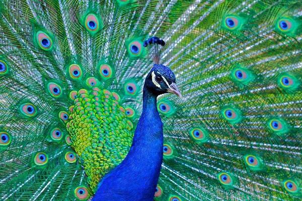 成年的蓝孔雀,特别是公孔雀常常追逐母孔雀,并将华丽夺目的舵羽上的覆羽通过皮肌的收缩,高举展开如扇状,俗称开屏,并且不断抖动,索索作响,并可多次开屏,每次长达5~7分钟之久,且左顾右转,翎羽上的眼状斑反射着光彩,引得母孔雀频频接近公孔雀。在群养情况下,为争配偶常引起剧烈殴斗,有时已发情的母孔雀被公孔雀追得无奈而受伤。