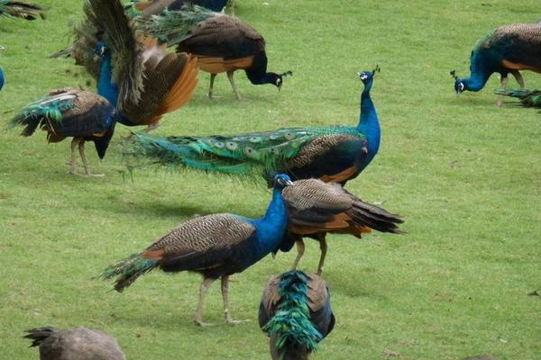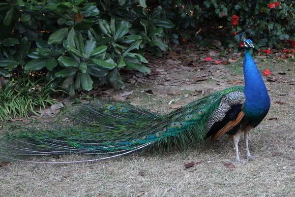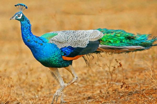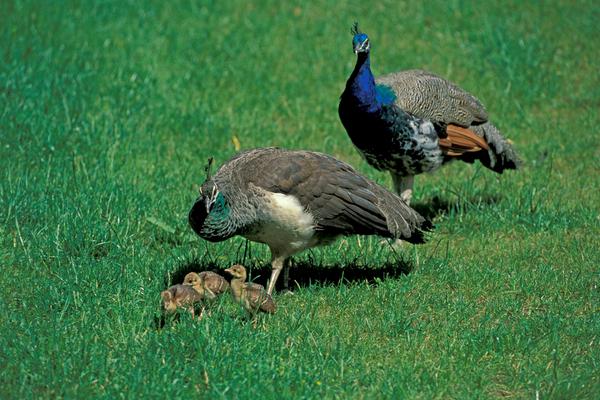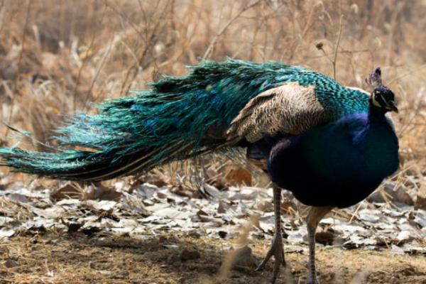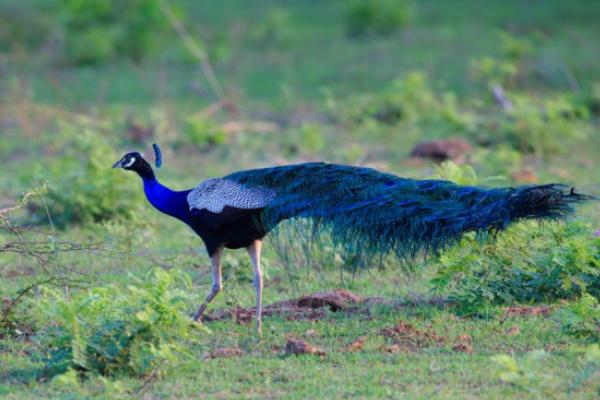 蓝孔雀的体型相对较小一些,腿、颈和翎羽较长,但是缺乏鞍羽。