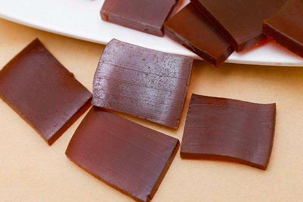 1、鹿角胶又名鹿胶、白胶,为鹿科动物梅花鹿或马鹿的角煎熬而成的胶块,多在冬、春季加工。先将鹿角锯成小段,置水中浸漂,每日搅动并换水1~2次,漂至水清取出,置锅中煎取胶液,反复煎至胶质尽出,角质酥脆易碎为止。将煎出的胶液过滤合并静置,再加入3%的黄酒和5%的冰糖,用文火浓缩成稠膏,倒入胶槽冷却成形即成。