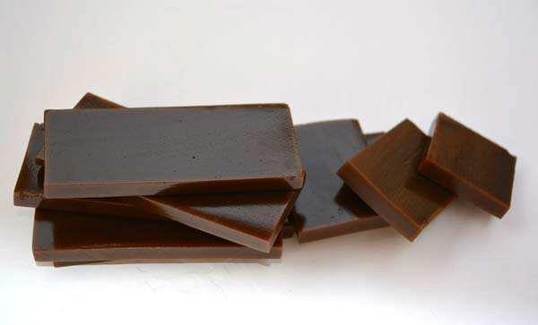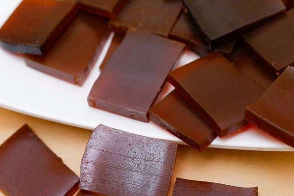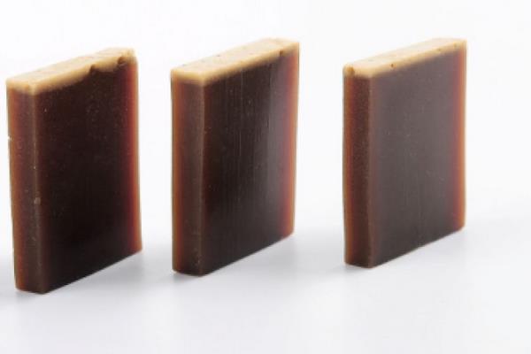 2、真品鹿角胶大多呈扁方片状,长宽各2~3厘米,厚约5毫米,表面黑棕色,光滑,对光照看显红棕色半透明,一侧有黄白色多孔性的薄层,系冷却时浮面的泡沫干燥而成;质坚而脆,易碎,断面玻璃状;闻之气无,口尝味微甘。