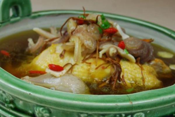 材料:子公鸡,素油,腌制过的鹿鞭,葱、姜、盐、料酒、味精、花椒水、酱油、八角适量。