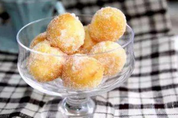 2、油锅烧至三成热,改用小火,将蛋糊做成丸子逐个放入锅中,轻轻搅拌,待蛋球浮上油面,变成淡黄色时捞出滤干油待用。