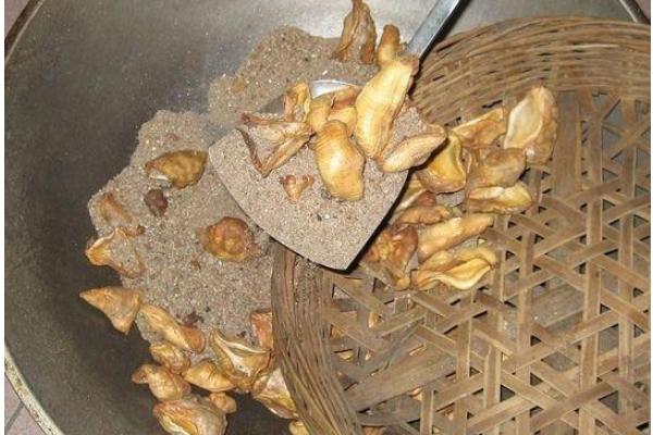 3、砂为炮制穿山甲的重要辅料,故砂质好坏直接关系到炮制成品的好坏。取河砂若干,用铁筛筛除粗粒,用清水洗净砂中泥土和细粉,烘干备用。先将蜂蜜置锅内溶化,加水和匀,再加入已洗净的河砂炒至干燥(蜂蜜:水:河砂=3:1:75,这有利于除去砂中有毒物质)。然后以砂:油=100:1的比例,油中加入菜油,一边拌砂,一边加热。炒至乌黑发亮,滑利而无油烟时方可。