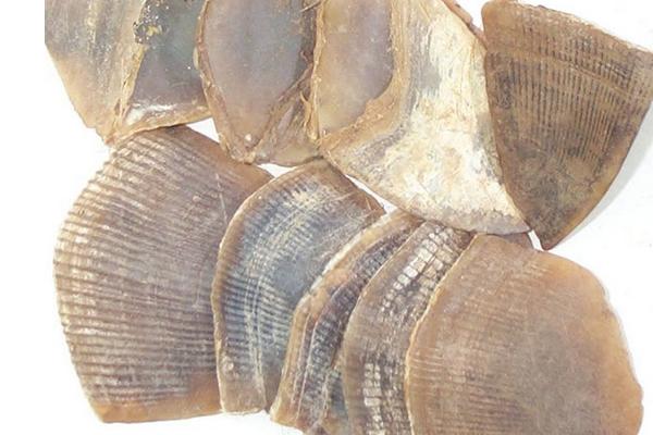 穿山甲的鳞片大多都是呈现三角形、菱形或者是扇面形的,中间位置比较厚而边缘比较薄。背面的颜色是黄褐色或者是黑褐色的,带有一定的光泽,而腹面的颜色则比较浅,中间有一条凸起明显的弓形横向棱线。鳞片的质地微微有些透明,韧性好还带有一定的弹性不容易被折断。闻起来味道腥,尝一尝则会有咸味。