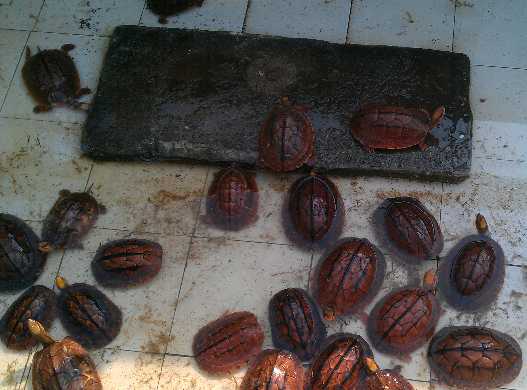 性成熟前,金钱龟雌雄难辨,性成熟后,其性别从外表特征可以鉴别。雌龟甲壳短而圆,背甲隆起,腹甲平滑,尾巴细而小,泄殖腔距肛门较近;雄龟较长、方形,背甲扁平,腹甲横断线附近较凹,尾巴较粗大,生殖器距肛门较远。性腺成熟时,龟体重250克以上。选择龟种应选个体肥大,无伤病,体重1000克者为佳,雌雄比为2:1。