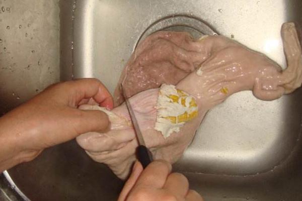 1、将野猪肚剪一个小口子,把内面层翻出来,用小刀把上面的残留物刮干净,特别是黄色的东西,那个最脏,隐藏着很多细菌和病毒。