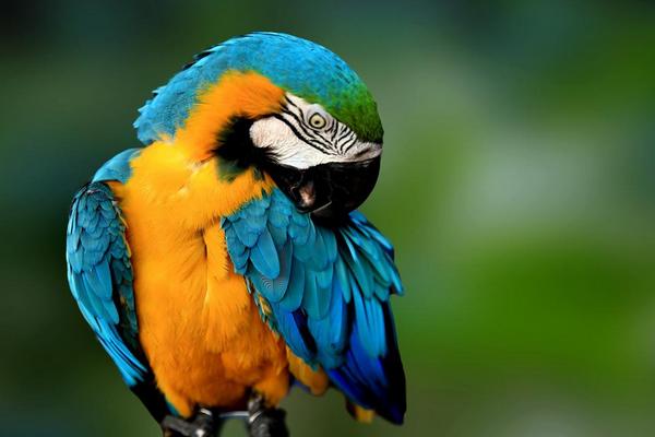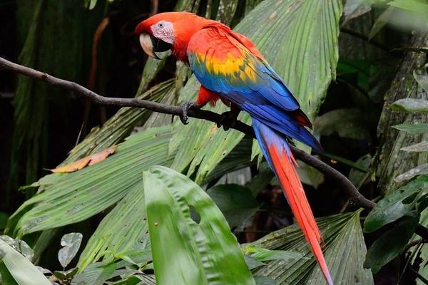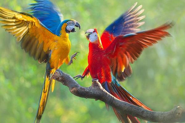 2、金刚鹦鹉:金刚鹦鹉产于美洲热带地区,是色彩最漂亮艳丽的鹦鹉,也是体型最大的鹦鹉,属大型攀禽。共有6属17个品种。具对趾足,每只脚有4只脚趾2前2后。该科鹦鹉尾巴长,看似镰刀状的大喙只有凤头鹦鹉可与其相比。以水果为食,食量很大,有力的喙可将坚果啄开,用舌有吸出果肉。面部没有羽毛,兴奋时可变为红色。