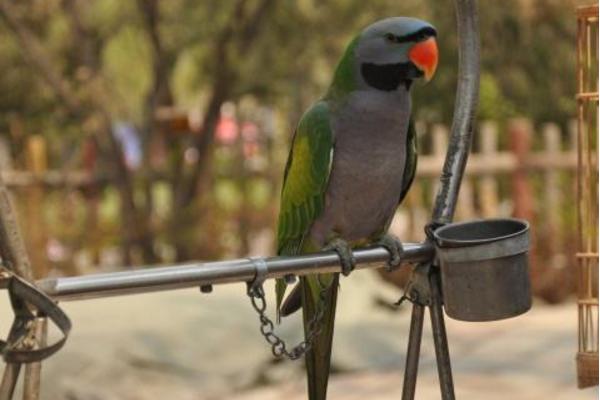 3、当公鹦鹉站在栖木上时可发现公鹦鹉的姿势是直立站着的,而母鹦鹉则是将身体尾部靠在栖木上。