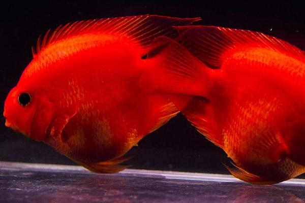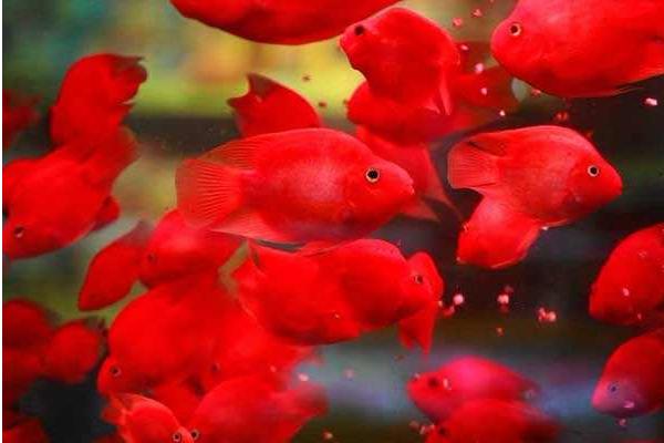 2、血鹦鹉鱼:血鹦鹉俗称红财神、财神鱼。其全身鲜艳通红,有着胖嘟嘟的体形和柔柔的鳍条,颜色红彤彤,十分讨喜,成年体长15-20厘米,体副宽厚,体呈椭圆形。