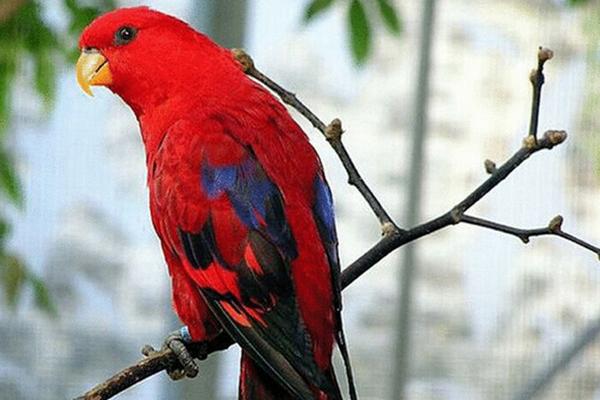 大绯胸鹦鹉属于大型鹦鹉,为我国特产鸟类。全长45厘米左右。上体绿色,前额、眼先黑色,头顶和耳羽蓝沾紫色,翅绿色,翅下覆羽葡萄红色。尾呈楔状,蓝绿色;尾下覆羽、腿羽黄绿色。下体除喉部有宽阔黑斑外,余部多为紫色,胸部紫兰色。嘴雄鸟红色,雌鸟黑色。脚绿色。