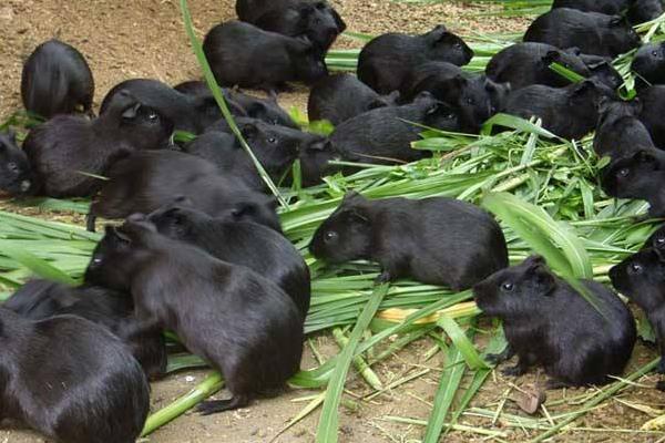 3、养殖豚鼠需要有足够的青饲料,可以是各种蔬菜的下脚料、玉米叶子、甘蔗叶子、丰富的各种树叶(95%以上的树叶都是豚鼠的食物)、红萝卜、红薯等。但建议一定配套种植一些牧草,一般来说,养殖200只种豚鼠连同后代至少要种植3亩以上的牧草。