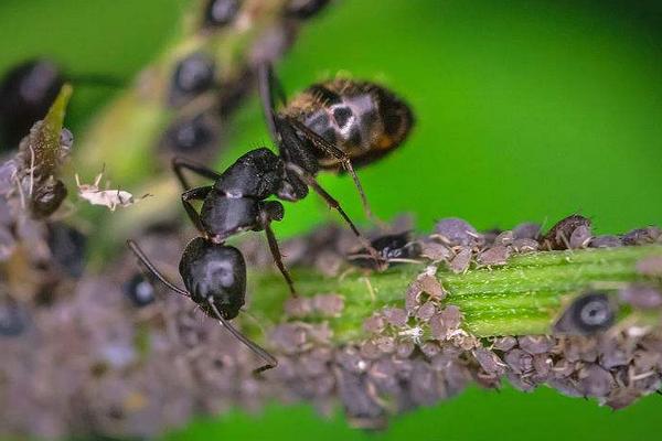 蚜虫会不断取食植物的汁液,因此它的粪便是带甜味的。所以哪里有了蚜虫,蚂蚁就随它赶来,用自己的触角轻轻地在它屁股上一扫,取下蚜虫的粪便即蜜露来享用。蚜虫会在秋末冬初产下卵,蚂蚁怕它们会冻死,通常就把蚜虫和卵搬到自己的窝里过冬。有的时候还会怕它受潮,影响到蚜卵的孵化,在天气晴朗的日子里,蚂蚁还要搬出窝来晒一晒。等到次年春暖花开的时候,小蚜虫孵出了后,蚂蚁就会把它们搬到早发的树木和杂草上,苣荬菜、蒲公英和花椒树的嫩叶上去。