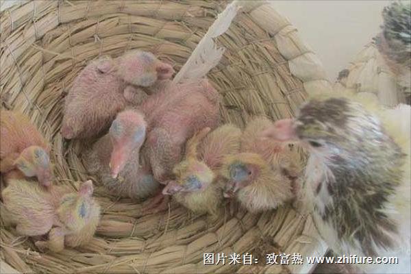 3、孵化管理:孵化多在产下每2个蛋后开始公、母轮流抱蛋,孵化期18天左右。蛋经过4~5天后,可进行第一次照蛋,将蛋对着亮灯,若蛋内有红褐色的血管,分布平均,呈蜘蛛网状,且外形稳固,即是受精蛋。孵到第十天,再用灯光照一次,如发现蛋的一侧乌黑,另一侧因为气室增大而构成较亮的空缺即为正常发育蛋,18天左右雏鸽琢壳而出。