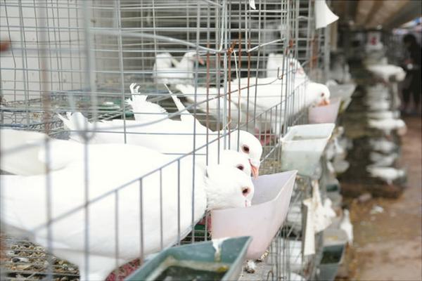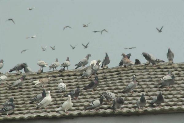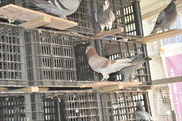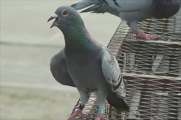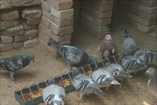 出入舍门:即让鸽懂得从进口入舍,从出口出舍。舍内熟悉训练结束后,即进行出入舍门训练。如有条件,可在鸽舍外从降落台至鸽舍顶罩训练网;如不具备此条件,可用橡皮膏贴住鸽的十根主翼。目的都是不让鸽飞跑。饲主用小粒饲料作诱饵,在舍外吹哨发信号,诱鸽从出门口到舍外。这时将出口门关闭,开放入口门(活辨门),再到舍内吹哨发信号,同时撒一些饲料在入口门附近内外,它们啄食时不知不觉地穿过活动栅进入舍内,这样就可诱鸽进出舍门。反复多次,就能形成习惯。