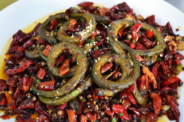 3、另起热锅冷油,油温8成熟放入大把花椒粒,3大汤勺干辣椒面,炒至油变红色转大火放入泥鳅,翻炒3分钟再放入几大勺干辣椒面,再放适量盐和蒜苗叶翻炒两下关火。