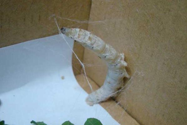 蚕宝宝到了五龄末期,就逐渐体现出老熟的特征:先是排出的粪便由硬变软,由墨绿色变成叶绿色;食欲减退,食桑量下降;前部消化管空虚,胸部呈透明状;继而完全停食,体驱缩短,腹部也趋向透明,蚕体头胸部昂起,口吐丝缕,左右上下摆动寻找营茧场所,这样的蚕就称为熟蚕。人们把熟蚕放在特制的容器中或蔟器上,蚕便吐丝结茧了,结茧可分为四个过程: