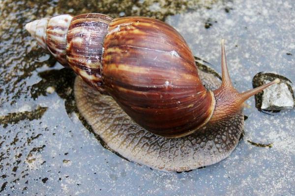 非洲大蜗牛(学名:AchatinaFulica)是中大型的陆栖蜗牛。成体壳长一般为7~8厘米,最大则可长到超过20厘米。夜行性,杂食性,大多是在潮湿环境中活动,喜欢在下雨及夜间出没。平时躲在阴凉的地方,且在壳口上做一层白膜(假口盖),只余一个小孔来呼吸,将螺肉缩入壳内以防脱水,等到环境转好后再出来。