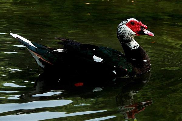 2、黑番鸭的羽毛为黑色,带有墨绿色光泽;仅主翼羽或复翼羽中,常有少数的白羽;肉瘤颜色为黑里透红,而且比较单薄;嘴角色红,有黑斑;虹彩为浅黄色,脚多为黑色。