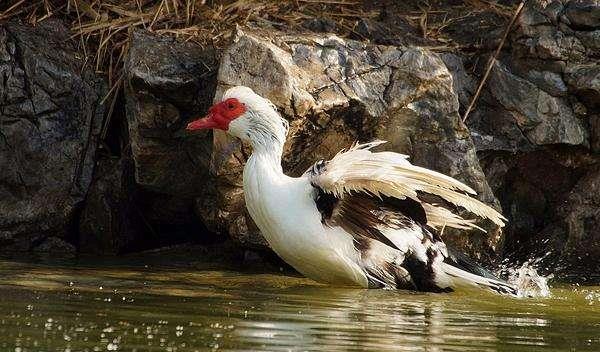 2、火鸭,学名-疣头鸭,南方对其俗称火鸭,北方对其俗称火雁,该物种源于美洲雁,后引入我国云贵高原繁衍至今。在我国贵州省的南部山区生活着一种奇怪的鸭子,当地人都叫它火鸭,又称憨包鸭,是一种稀有的特禽珍品。火鸭是一种驯化时间比较短的品种,本身具有飞行和下水的习性,不过水性比其它鸭子差,人工驯化的过程中,特意退化它的下水习性,以适应山区或缺水地区的饲养,所以火鸭比其它鸭子耐旱耐高温。