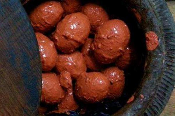 3、再将洗净晾干的鲜鸭蛋逐个放入粘泥,待鸭蛋均匀粘上泥沙后取出,放入食品袋或其他容器内,3周后即可取出洗去泥沙煮食。