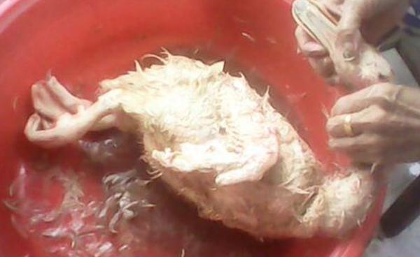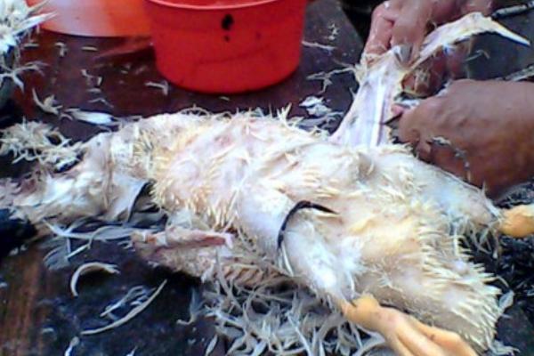 4、等血流尽了,去烧一锅开水,把鸭浸在里面,趁热拔毛。拔毛后就是开膛去内脏了。