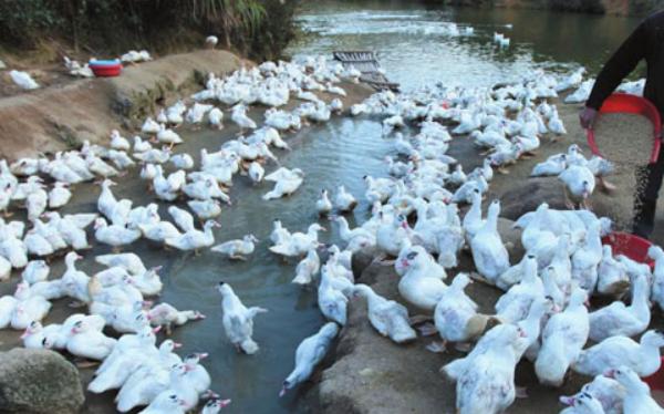 3、做到每天喂2次,上午8时,下午4~6时;产蛋期喂4~5次;成鸭每只鸭每天喂150~160克饲料,要给足清水供饮用。