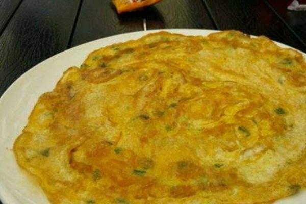 3、底锅加油,烧微热倒入咸菜糊,摊平,小火,底面焦黄后翻另一面。两面都煎焦黄,咸菜饼就熟了,但是还是不能马上就拿出来,要把饼在锅里用东西给分成小块的,接着再煎,这样饼边也会脆脆的,香喷喷的鸭蛋咸菜饼来了。