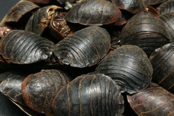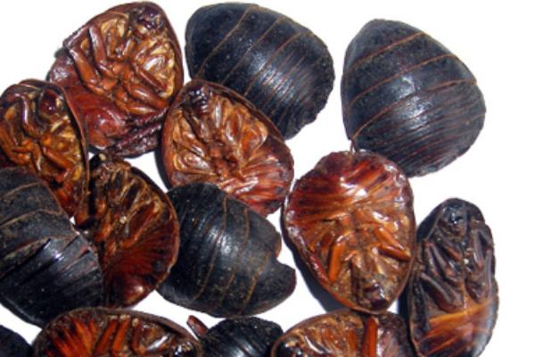 虫体呈卵圆形而扁平长2-3,,宽1-2厘米。头部一端较窄,尾部较宽。背面紫黑色,呈甲壳状,为九个横节复瓦状排列而成。腹面深棕色有光泽,可见头部形小、呈棕黑色,并有触角一对,但商品中多已脱落。胸部有足三对,弯曲。腹部隆起,可见弯曲的节。尾部节较宽而略尖。