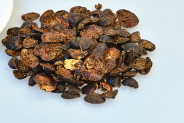 加工处理一般采用晒干、烘干两种方法。晒干法比较简单,将采收的虫子用开水烫死,洗净,置阳光下曝晒3~4日,达到体干无杂质即可,烘干法就是将洗净的虫子放在烘箱内烘干或放在锅内用小火炒拌,温度控制在50℃左右,待虫体的足尖微粘锅铲时便停火。将虫放在比锅略大的铁丝网内,撤掉炒锅,将网架在灶上,借灶膛中的余热将虫体烘干。即成商品地鳖虫。因采集季节、虫龄及壮瘦程度不同,鲜干折合率有一定差异,经测定统计,最大的雌成虫140只重0.5kg;干的雄成虫需1400只才0.5kg,地鳖虫鲜干折合率最大雌虫37%,青年雌虫38%,老雌虫41%,8龄雄若虫38%。