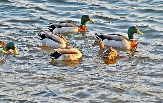 2、绿头野鸭一年两次换羽,夏秋季全换(润羽),秋冬季部分换羽。在繁殖期,雄性成年野鸭色彩艳丽,头、颈羽有翠绿色光泽,颈基部有一道狭窄的白色项圈,体羽 灰色,胸部棕色,腹羽淡色、有暗褐色微斑,翼羽灰褐色,翼镜呈金属紫蓝色,尾羽黑色,中央两对向上卷曲似钩状,最外侧尾羽大多灰白色,喙、脚灰色,趾、爪 橙色。雌性成年野鸭头顶至枕后羽色为黑色或棕黄色,体羽棕色,深浅不一,具棕黄色、白色羽喙和V形斑,翼羽与雄性鸭相似,尾羽缀有白色,喙灰黄色, 趾、爪一般为橘黄色,也有灰黑色。刚出壳的雏野鸭,全身披黑色绒毛,肩、背、腹部有淡黄色绒毛相间,喙、脚黑色,趾、爪黄色。