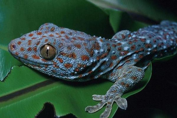 蛤蚧体长可达30厘米以上,头长大于尾长。背腹面略扁,头呈扁平三角形,皮肤粗糙,全身密生粒状细鳞,体色有深灰色、灰蓝色、青黑色等,头、背部有深灰、蓝褐等颜色横条纹,全身散布灰白色、砖红色、紫灰色、橘黄色斑点,尾有白色环纹。