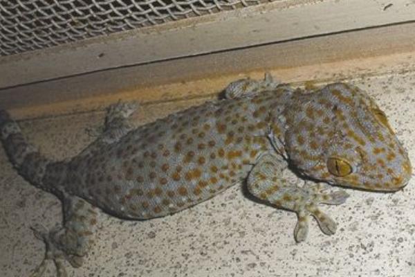 成年蛤蚧全长可达300毫米。尾长与头体长相等或略长,是最大的一种壁虎。背面砖灰色,密布橘黄色及蓝灰色斑点,尾部有深浅相间的环纹;腹面色灰白而有粉红色斑。头大,略呈三角形,躯干背腹扁平,通身被覆细小粒鳞,其间杂以较大疣鳞,缀成纵行;腹面鳞片较大,略呈六角形。四肢长短适中,指趾扁平,其下方具单行皮肤褶襞;除第一指趾外,均具小爪,指间与趾间仅有蹼迹。雄性具肛前孔20余个。吻鳞不接鼻孔。