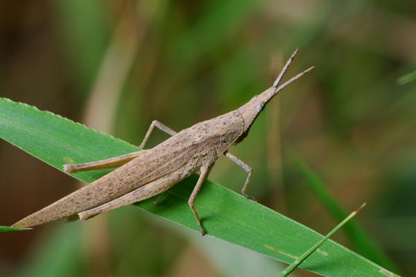 成虫雄虫体长30~47mm,体细长。头圆锥形,明显长于前胸背板。头顶突出,中央纵隆线明显,颜面极向后倾斜,隆起处极狭,全长具纵沟。复眼长卵形,着生于头部近前端。触角剑状,较短,基部数节较宽。前胸背板宽平,具有小颗粒,侧片后下角呈锐角,向后突出。前翅发达,长25~36mm,狭长,超过后足腿节顶端,顶角尖锐;后翅略短于前翅,长三角形。后足腿节细长,跗节爪间中垫超过爪端。雌虫体长58~81mm。前翅狭长,25~65mm。产卵瓣短粗,下生殖板后缘具3个突起。若虫(蝗蝻)有6个龄期。