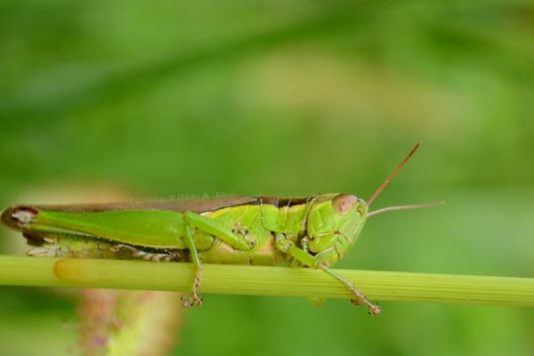 蚂蚱,尖头的昆虫,有绿的,有灰的,会蹦会飞,雌性成体大约5公分长,雄性只有雌性一半大。蚂蚱口大、下巴发达,以植物叶片为食,蝗虫喜食芦苇、稗草、白茅、狗牙草及蒿类植物,虾须草和海蓬子。
