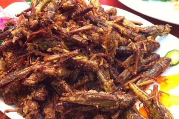 从前,北方的农村深受其害,天津人竟恨到剥其皮,食其肉的程度。久而久之,蝗虫没有根除,却吃出一道名特小吃。逛津城,不吃油炸蚂蚱,是一大憾事。油炸蚂蚱,肥而不腻,又酥又香又脆,如果夹在刚刚烙熟的热饼里,那真是满口异香,味道好极了。所以天津卫流行着一句歇后语,烙饼卷油炸蚂蚱--夹(家)着吃去吧!光绪年间,鼓楼北于十的油炸蚂蚱很有名气,妇孺皆知。后来西门内沈家栅栏有一个摆摊的,蚂蚱炸成通红色,味道更好。后来,人们把活蚂蚱用开水烫一下,然后晒干或晾干,存放到冬季炸着吃,其味道也甚为鲜美。