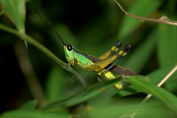 台湾大蝗是台湾所有蝗虫中体型最大的一种,雌虫身长大于雄虫,体色为鲜艳的绿色,头、胸具凹凸不平的瘤斑,复眼下方具一条黄色的纵纹,成虫秋季出现,夜晚会鸣叫,以后脚和前翅摩擦,会发出刷沙的声音。