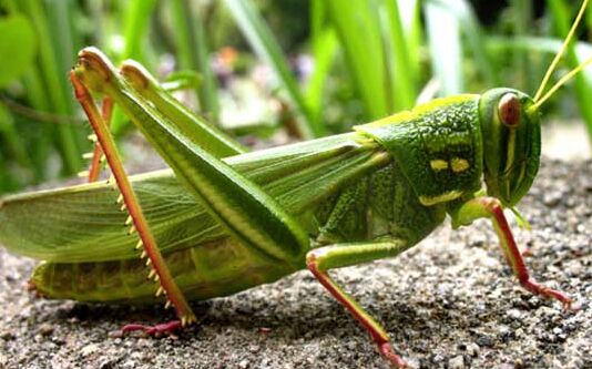 蝗虫口大、下巴发达,以植物叶片为食,蝗虫喜食芦苇、稗草、白茅、狗牙草及蒿类植物,虾须草和海蓬子。全世界有超过12000种。分布于全世界的热带、温带的草地和沙漠地区。
