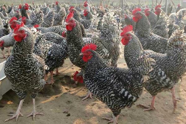横斑羽是该鸡外貌的基本特征,全身大部分羽毛呈黑白相间、宽窄一致的斑纹状。母鸡头部和项羽边缘镶嵌桔红色或土黄色,羽毛紧密,清秀美观;公鸡项羽和鞍羽多呈红色,尾羽呈黑色带有绿色光泽。头型多为平头,冠形以单冠最多,喙基部为黑色,边缘及尖端呈白色。虹彩以桔红色为最多,土黄色为次之。胫色以白色为主,爪部颜色以白色最多,皮肤颜色均为白色。