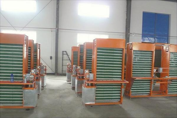 ②湿帘-风机降温设备。由湿帘和风机两部分组成。通过低压大流量节能风机向外排风,鸡舍内形成负压,舍外的热气经过湿帘变冷进人鸡舍,以纵向通风方式,从而使鸡舍温度下降。这种湿帘-风机降温设备的效果很好,只适于密闭或半开放式鸡舍,使用时鸡舍必须密封或关闭窗户和卷帘,才能形成负压通风。