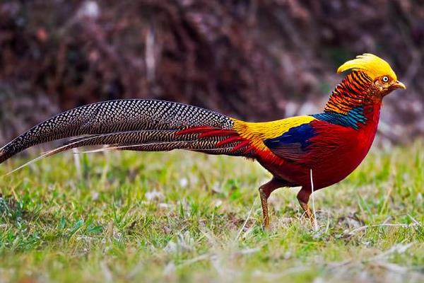 分布青海、甘肃、陕西、四川、贵州、湖北、湖南、广西。雄鸟全长约100厘米,雌鸟约70厘米。雄鸟头顶具金黄色丝状羽冠;后颈披肩橙棕色。上体除上背为深绿色外,大都为金黄色,腰羽深红色。飞羽、尾羽黑褐色,布满桂黄色点斑。下体通红,羽缘散离。嘴角和脚黄色。雌鸟上体棕褐,尾淡棕色,下体棕黄,均杂以黑色横斑。栖息于海拔600~1800米的多岩山坡,活动于竹灌丛地带。以蕨类、麦叶、胡颓子、草籽、大豆等为食。3月下旬进入繁殖期,筑巢于乔木树下或杂草丛生的低洼处,每窝产卵5~9枚,淡黄褐色,无斑,孵卵期22天。