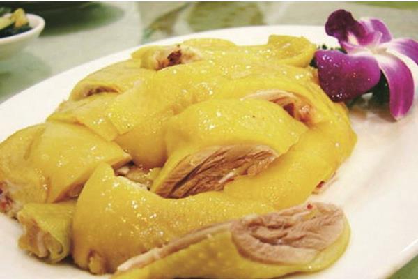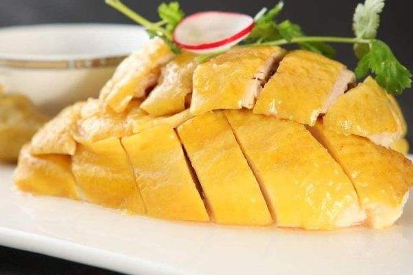 2、煮一锅沸水,把腌制过的鸡去除料头之后,用沸水烫鸡身,鸡内壳要充分浸入沸水里.提起鸡身流出鸡内壳水,重复以上动作三次,这样既可去除异味又可初步段生,浸鸡汤水重新加热,放入整鸡,鸡内壳一定要让汤水充分浸入,汤水要盖过整鸡为佳.大火重新煮沸后马上关火,盖上锅盖,焖至13-20分钟,视鸡身的大小或者新鲜鸡冷冻鸡来决定浸熟时间。