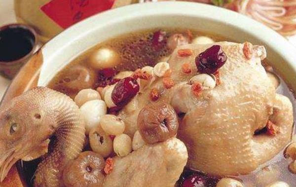 做法:老母鸡宰杀,去净毛桩和内脏,洗净,红枣、枸杞洗净泡发,鹌鹑蛋煮熟去壳;锅中水烧开,放入鸡汆烫,捞出放入碗中,加入红枣、鹌鹑蛋、桂圆、莲子、白糖、味精、盐、姜、葱等调味料。将调好调味料的鸡上蒸笼蒸2小时至熟,取出撒上枸杞即可食用。