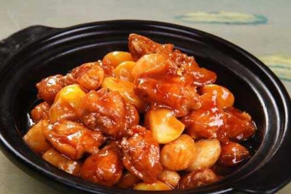 2、原锅放熟猪油(50克)烧热,放人京葱、姜块煸香,加入猪排,煸至变色,将鸡翅膀倒人,放入绍酒、酱油、白糖及鸡清汤,烧滚,移至文火上焖烧20分钟。待鸡翅酥熟,改用旺火,将水发香菇和切成厚片的笋一起下锅,沸煮到汤汁稠浓,捞出猪排和姜块,烹人红葡萄酒,倒人盖碗内即。