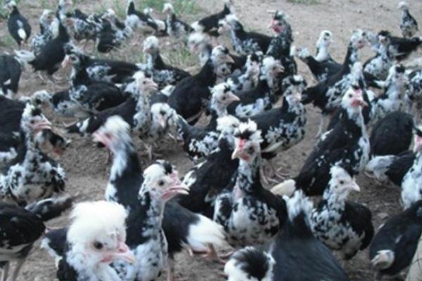 外貌特征:贵妃鸡结构紧凑,胸肌发达。头小,着华丽毛冠,犹如欧洲贵妇的帽子,母鸡毛冠几乎覆盖整个颜面,公鸡冠后侧有形如圆球形的大朵黑白花羽***。颌下有胡须。三冠,冠体两侧为碗状发达的肉质体,延伸成V形,色泽鲜红,公鸡冠挺立。皮肤薄、呈粉白色,皮下脂肪小,毛孔小而致密。肌肉结实,骨骼细而坚硬。五爪。胫较细,粉白底色上点缀浅黑色斑点。黑白花羽,全身羽毛基本为黑色,白色飞花不规则地分布于全身。2:贵妃鸡的生产性能:父母代种鸡产蛋量高,采食量少,产蛋期日耗料65-75克,年产蛋160-180枚,蛋重40克左右,蛋壳乳白色,白里透红。蛋型呈长椭圆形,成年母鸡体重约1150克,公鸡约1500克。商品代肉鸡:抗病力强,易饲养,生长快,1日龄鸡苗重25-30克,正由于贵妃鸡活波好动,又善于低飞,具一定的野性,因而其商品鸡养至80-90日龄即可上市,甚至在60日龄左右即颇具美味。