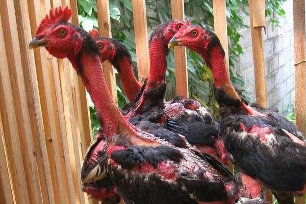 5、憨打鸡:既不管鸡,不会转圈,又不会压脖,又不会游等。就只靠靠脖子咬住对手头部从正面起腿。不善于自我防守,直来直去的那种,侧面腿少,这种鸡打功很差,从打功上来说,其它打功的都可以破它。