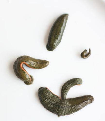 又名:医用蛭。体狭长稍扁,略呈圆柱形,体长3~5厘米,宽4~5毫米,背面绿中带黑,有黄色纵线5条。腹面子坦,灰绿色,无杂色斑纹。体环数103;环带不显著,占15环。雄生殖孔在31~32环沟间;雌孔在36~37环沟间。眼5对,列成弧形。体前端腹面有一前吸盘。食道纵褶6条,颚3片,半圆形,颚齿发达。后端腹面有一后吸盘,碗状,朝向腹面,肛门在其背侧。